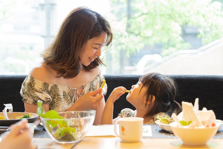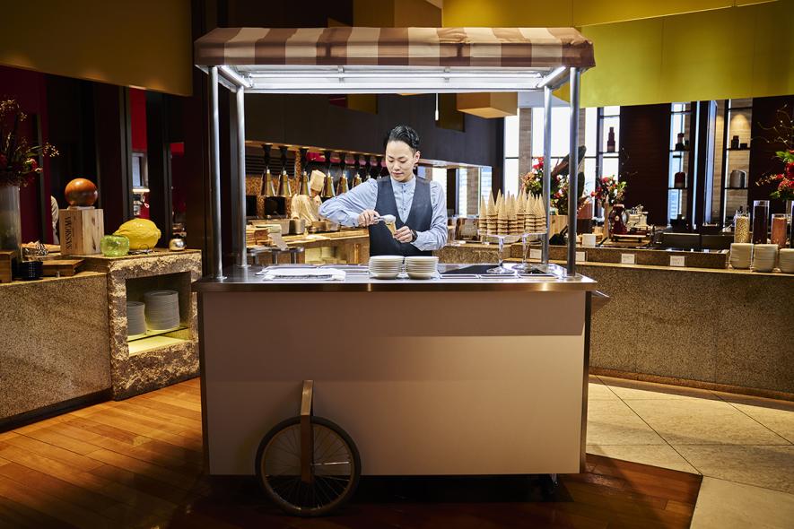 ホテルのシグネチャーレストラン「ノカ ロースト&グリル」では、前菜とデザートがブッフェで、メインディッシュは約8種から好きな1品(メニューによって追加料金あり)を選べるセミブッフェスタイルのランチが楽しめます。「農家」とつながるレストランを目指し、地元の食材や季節の食材を使用。素材本来のおいしさを最大限に引き出すシンプルな方法で調理されたグリル料理にも定評があります。子どもが食べやすい料理も豊富に用意されているので、ホテルランチのデビューにもぴったり。特に、デザートコーナーに設置されているマシュマロやスプリンクルをトッピングできるアイスクリームカートは子どもから大人気です。