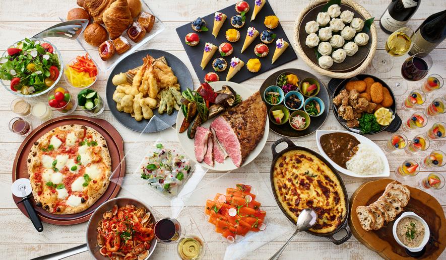 そのロビーを奥に入ったところにあるのが「オールデイダイニング ラジョウ」。昭和や夏祭り、“ヴァイキングの宴”など、ユニークなテーマのランチブッフェを開催しています。デリ、メイン料理、スイーツ、アイスクリームと見た目も楽しい料理の数々が並びます。平日ランチは時間内無制限なので、ゆっくりと過ごせるのもうれしいポイントです。