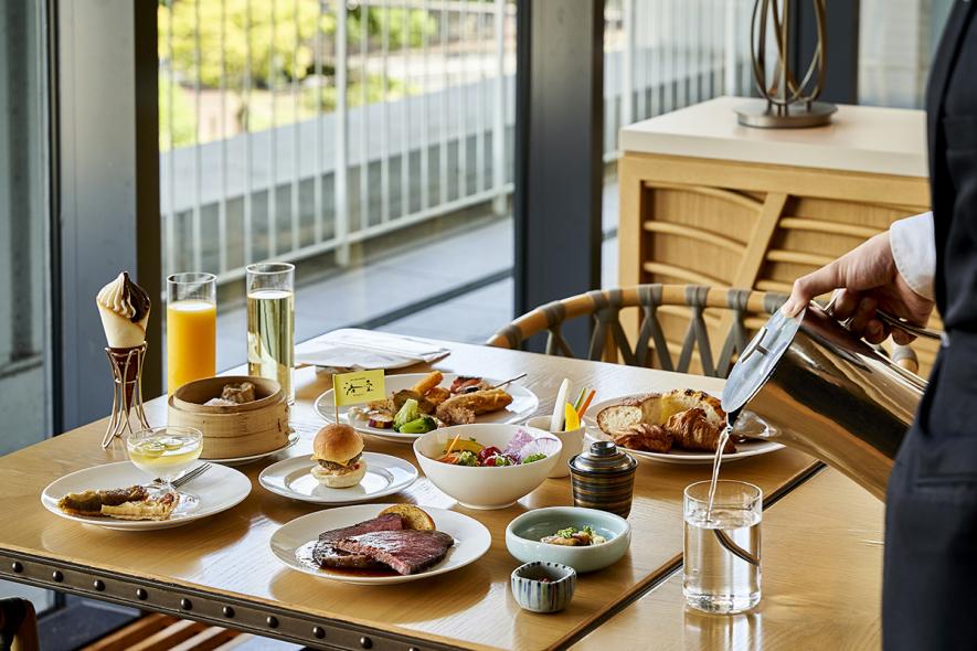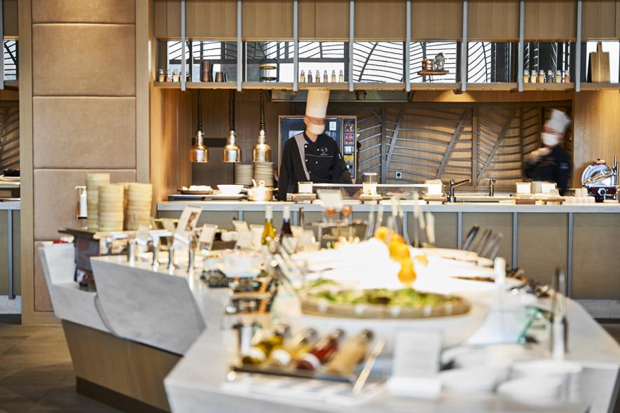 その2階にある「Folk Kitchen(フォルク キッチン)」は、誰もが気軽に集まれる場になってほしいという想いを込めて家族や仲間を意味する“folk”を名前に冠したダイニング。ランチブッフェではインターナショナルな料理が約40種味わえます。オープンキッチンスタイルのキッチンシアターステーションでは、シェフが注文に合わせて出来立ての料理を提供。サステナブルな材料を用いたメニューもあり、アレルギーなどの食事制限がある人の要望も可能な限り対応してくれるなど、ホスピタリティにあふれています。公式サイトからの予約では、平日ランチブッフェやフリーフロー(飲み放題)の割引が受けられることもあるので要チェックです。