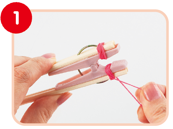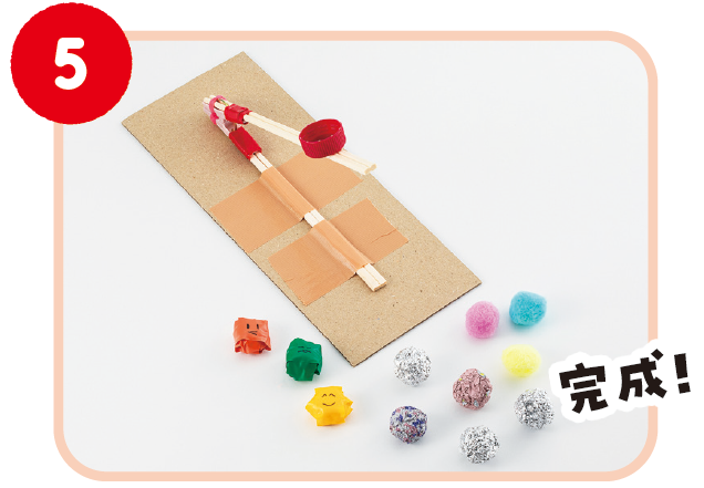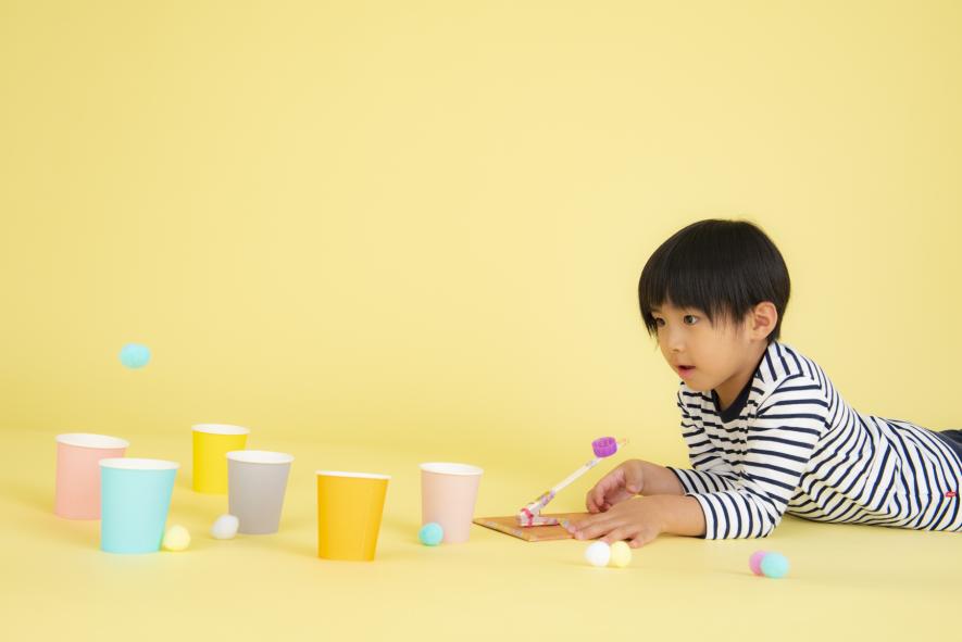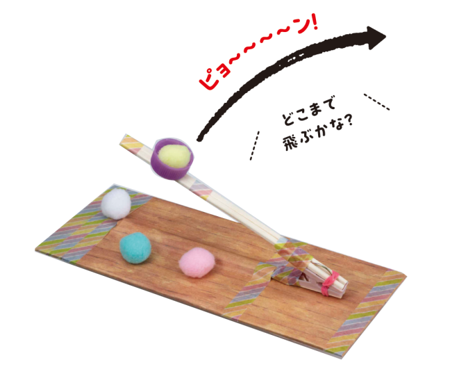 発射台に乗せたポンポン、指先の力加減で飛び方が変わるよ!