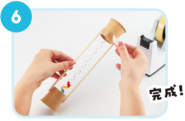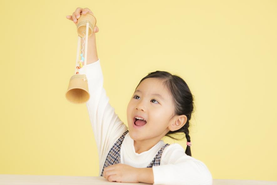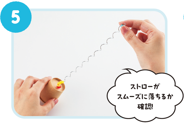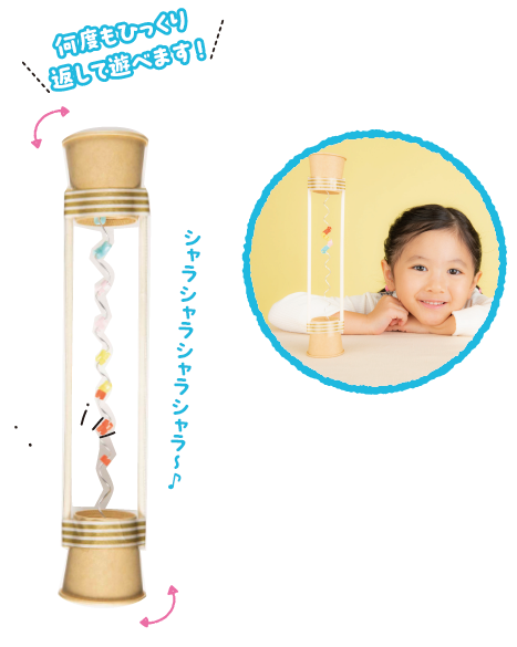 落ちてくる時の動きや色とりどりのストローに目が釘付け。落ちてくるものを目で追う力や想像力、観察力が育ちます。