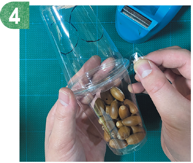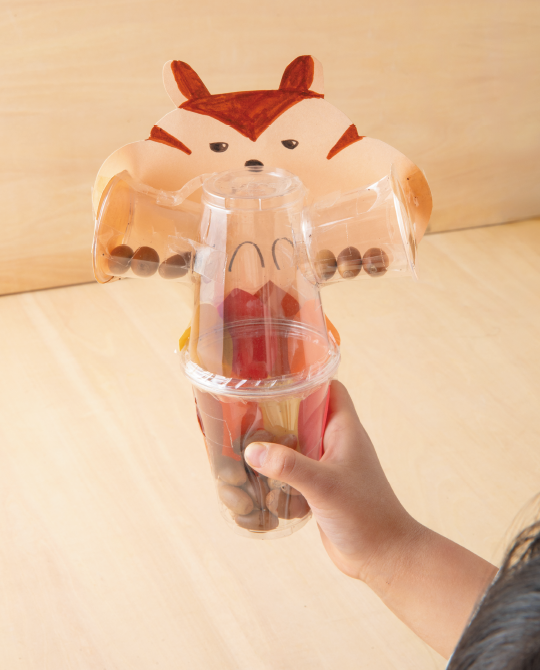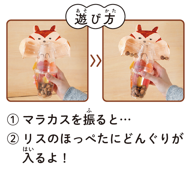 マラカスを振るたびに、右と左のほっぺたに、どんぐりが何個入ったか合わせて数えてみよう!