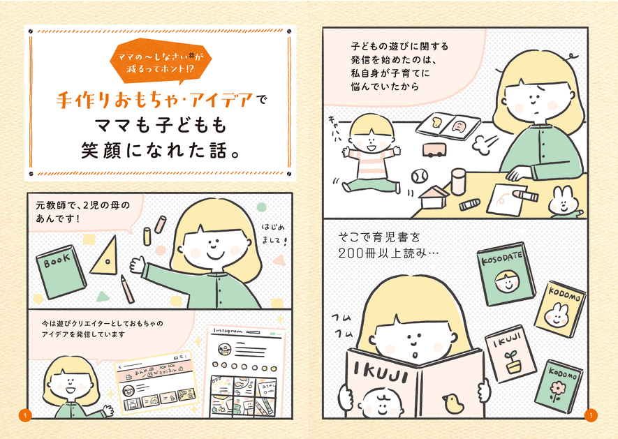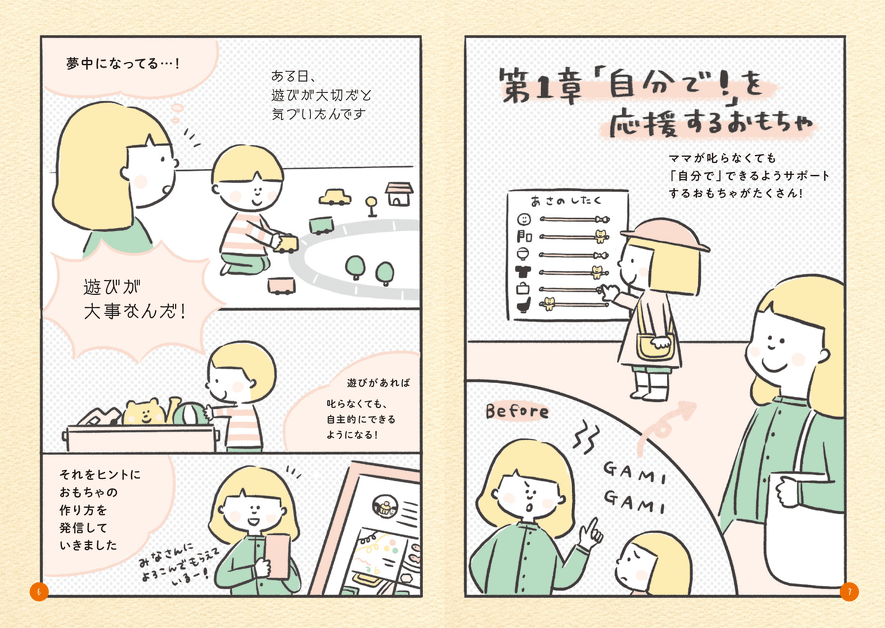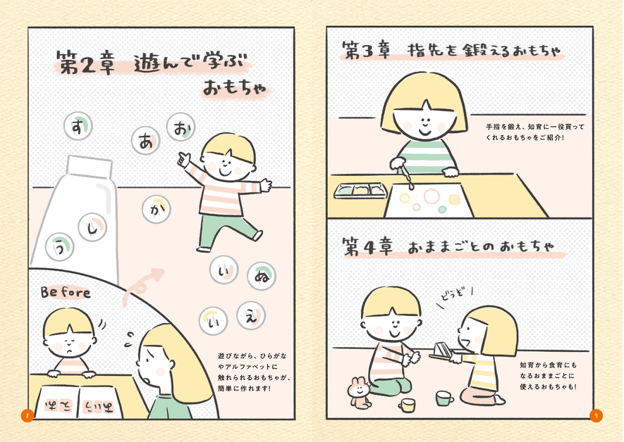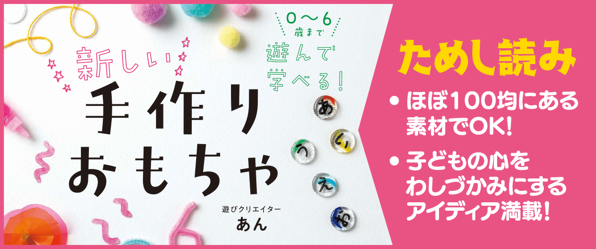 一覧へ 次の回 「自分で!」を応援するおもちゃ 『0~6歳まで遊んで学べる! 新しい手作りおもちゃ』第1回 2022年11月07日 保護者 保育士・幼稚園教諭 手作りおもちゃ この記事をブックマークする 総フォロワー数50万人超のあそびクリエイター、あんさん発の「ママの〇〇しなさい」が減るおもちゃの作り方を公開! 『0~6歳まで遊んで学べる!新しい手作りおもちゃ』の中身をお試し連載します! 「自分で!」を応援するおもちゃを紹介します!! 次のページへ…▶ 1 2 この記事をブックマークする 一覧へ 次の回 この記事をシェアする