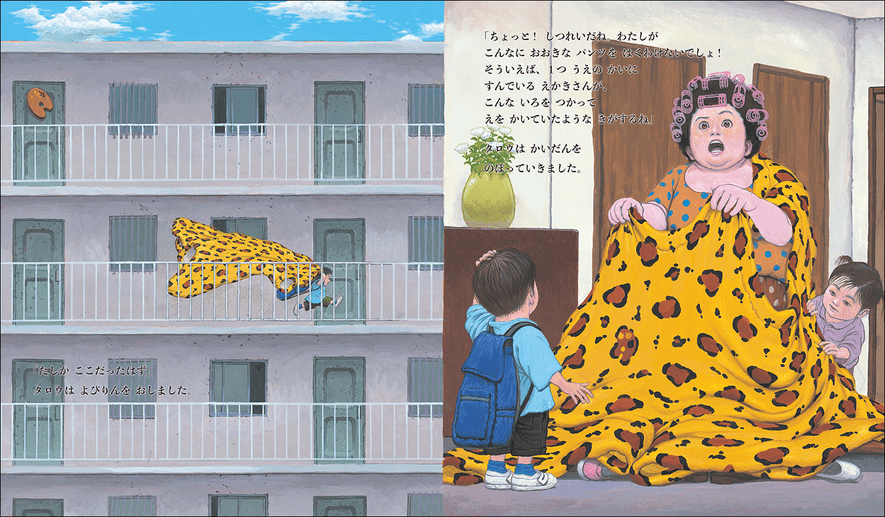 団地の前の公園で遊んでいた主人公のタロウ。突然、頭の上に黄色の布が降ってきました。どこかで見たことのある模様です。これは……まさかパンツ?