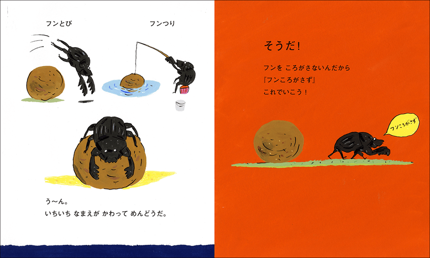 丸めたフンの上にひとりたたずむフンころがし。フンころがしは悩んでいました。「ぼくはこのままでいいのだろうか」と。『フンころがさず』は、フンをころがすことに疑問をもったユニークなフンころがしを通じて、お子さんの自己肯定感を育てる物語です。