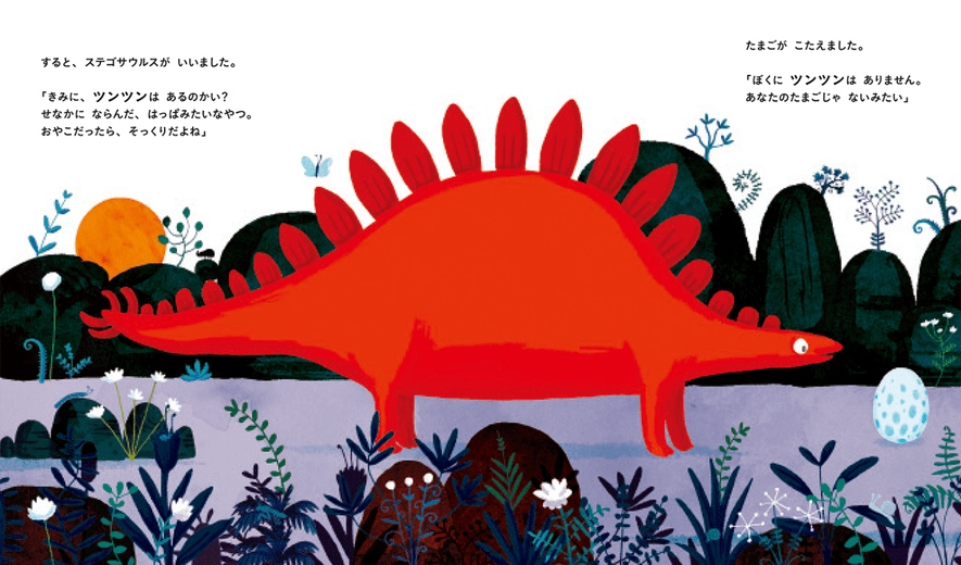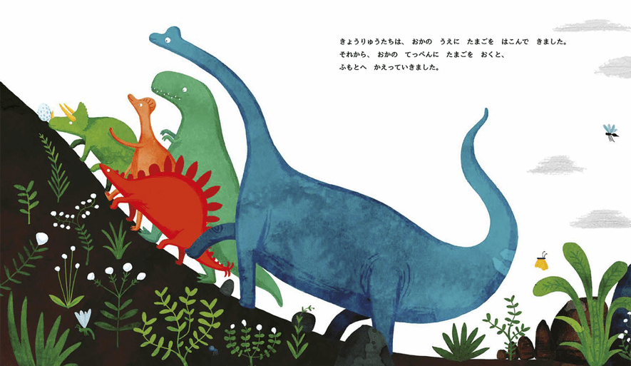 この本を訳したのは、夜の路上で、大人に絵本を読み始めた「聞かせ屋。けいたろう」さん。革のトランクに絵本を詰め込んで、親子読み聞かせ、絵本講座、保育者研修会で全国を駆け巡って活躍され、絵本の文章や翻訳も手がけられています。「聞かせ屋。けいたろう」さんだからこそ拾い集めることができた、リアルな声や反応を、文章に反映させた翻訳も絵本の魅力の一つです。たまごを巣に戻すために恐竜たちが山を登る場面で、「たまごが まいごだ、うんとこしょ えっちら おっちら どっこいしょ」と訳したのは、とても面白い訳になっています。韻を踏み、繰り返しがあり、「うんとこしょどっこいしょ」や「えっちらおっちら」の日本語のおもしろさが生きています。読み聞かせの時には、思わず子どもたちとも笑顔で口ずさんでいました。