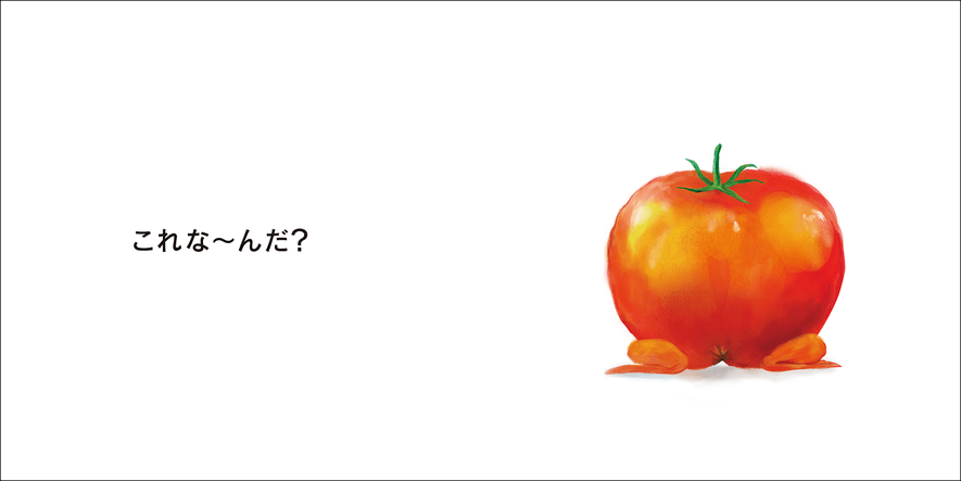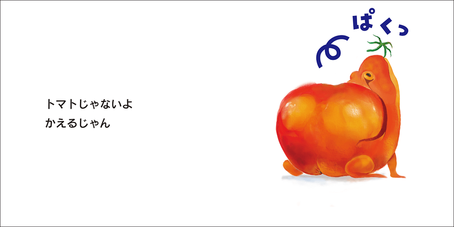 絵本を開いて、まず目にとびこんできたのは、つやつやの完熟トマト。……だと思ったら……なんだか下に2本の足らしきものが見える……。「これな~んだ?」と聞かれて頭の中はハテナマークでいっぱい。“見たことないよね、こんなもの”という表情の子たちと顔を見合わせながら次へページをめくると……「トマトじゃないよ かえるじゃん」。おしりをこちらに向けてうずくまっていたオレンジ色のかえるが頭をあげて、緑のヘタみたいなものを、ぱくっ。