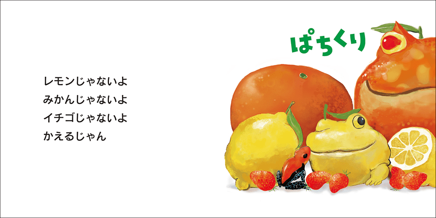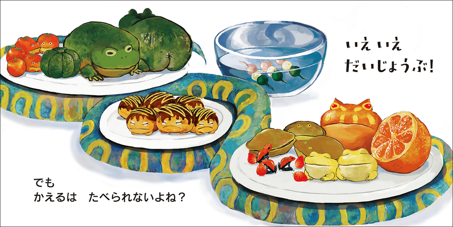 いつまで「かえるじゃん」が続くのかと思っていると、最後のほうにちゃんと“ハズレ”があります。子どもはたいてい引っかかり「かえる!」と答えるのですが……!? ページをめくって「まだかえるじゃないよ」なんて読むとき、大人の読み手はニヤニヤしちゃうんです(笑)。さんざん食べ物のふりをしてきたかえるたち。お皿にのせられ……。最後はさらにハラハラ、ドキドキ、笑顔になるエンディングが待っています!