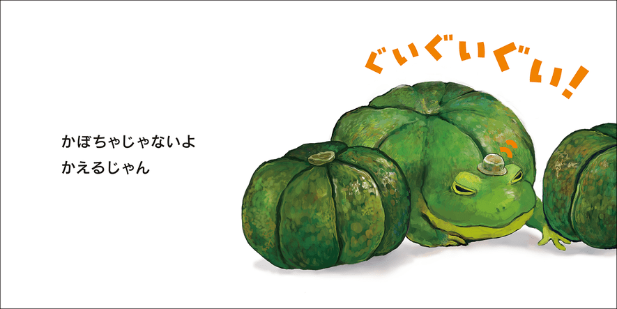 おいしそうな食べ物が、実は顔をあげたり飛び上がったりすると「かえるじゃん!」。隠し絵のおもしろさ(あんまり隠れていないですが)と、「かえるじゃん」とわかった場面の仕草や表情がいかにもかえるらしく、おどけた雰囲気で、楽しい気分になってきます。