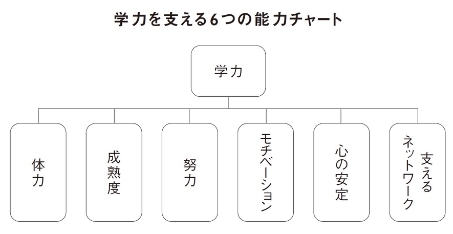 「学力を支える6つの能力チャート」(上記参照)をみると、学力以外のことが総崩れではその学力を最大に発揮できないことは一目瞭然かと思います。中学受験を支えるために親子で非認知能力を育成することで塾や学校での学びを最大化する構図が明白になります。