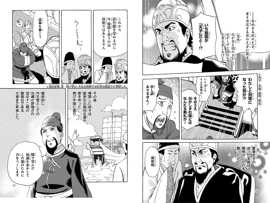 ここでは「日出ずる処の天子、書を日没する処の天子に致す」という文面に対して隋の皇帝である煬帝が怒ったというエピソードは有名ですが、昔は煬帝が激怒した理由は日本のことを「日出ずる処」、隋のことを「日没する処」としたためである、という説がありました。しかし現在ではそれよりも日本が隋に対して、対等な「天子」という呼称を用いたことが問題だったという考え方が主流です。本書ではそういった新しい歴史観にも対応している点が素晴らしく、専門家を監修に付けているだけでなく、情報のアップデートも丁寧におこなわれていることが見て取れます。