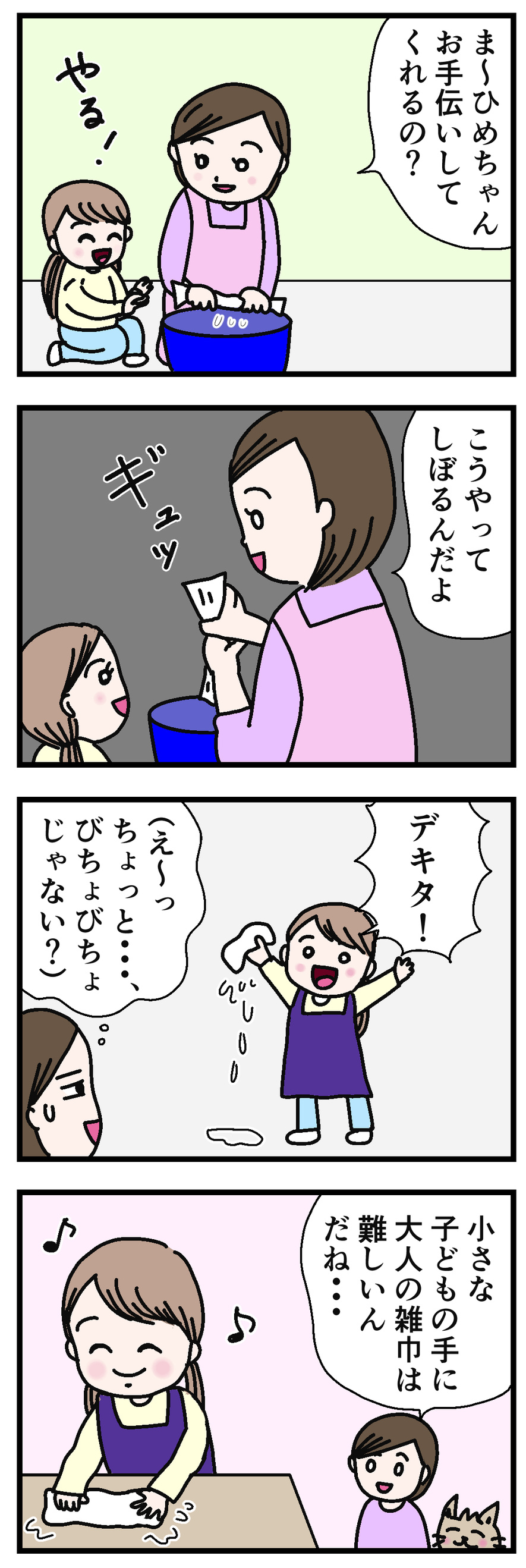 私達が小学校のお掃除の時に体験してきたような、「ぞうきん絞り」は、かなり手の力が必要だったことを覚えていませんか? 実は、年中・年長さんくらいでもぞうきんがしっかりと絞れる子どもは意外と少なく、絞ったところで、水がびちゃびちゃ、ということも多いかと思います。では、どうしたらいいのでしょう?