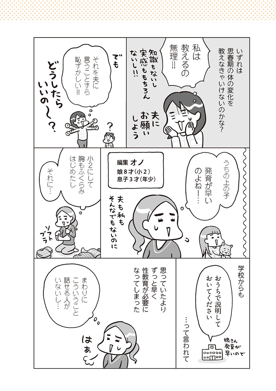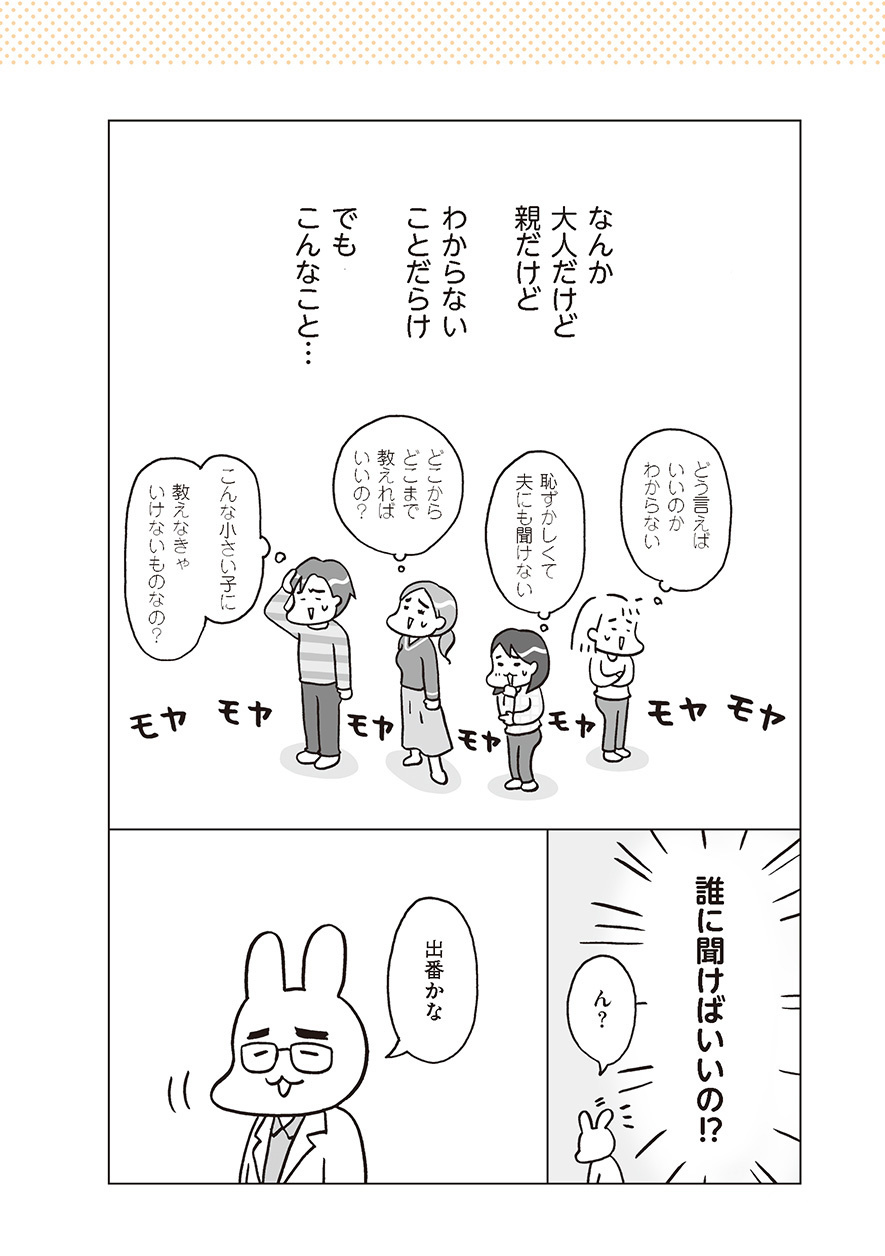 「うちにも赤ちゃんはくる?」といった突然やってくる素朴な質問への答え方から、性犯罪の被害者・加害者にならないための日々の言葉かけ、思春期に訪れる男女の心と体の変化まで、親子で一緒に学ぶことができます。
