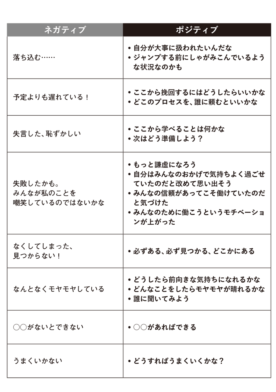 とネガポジ変換します。自分で自分の不安を増強させるのではなく、前向き質問をすることで、自分の発想をポジティブシンキングに変えるのです。